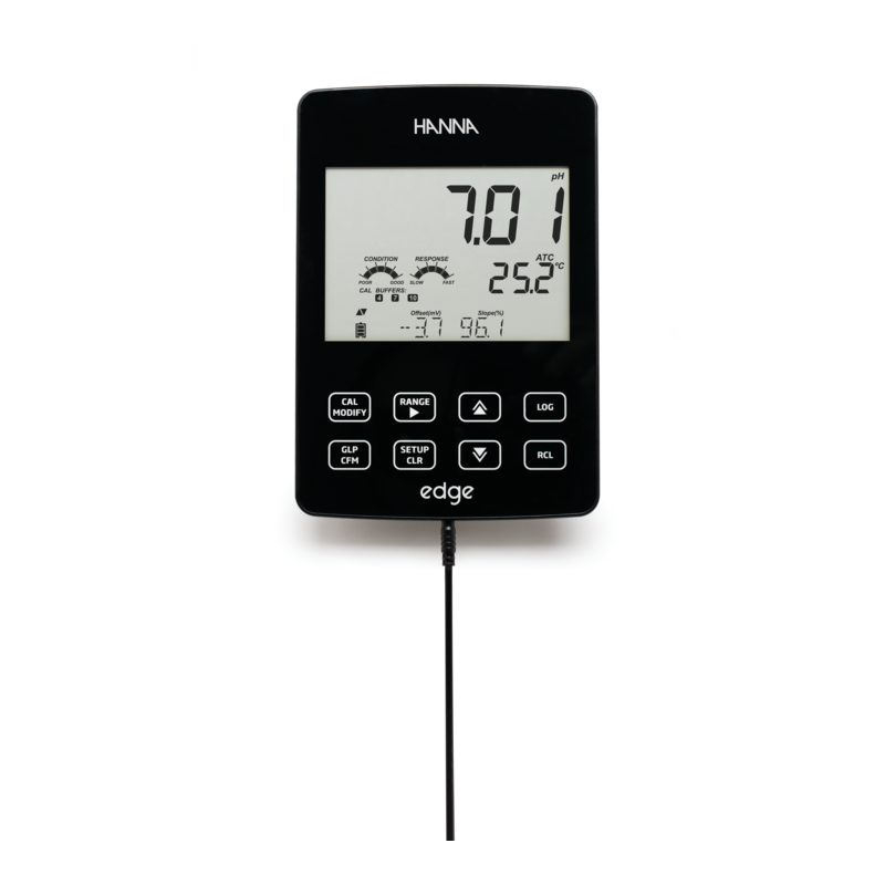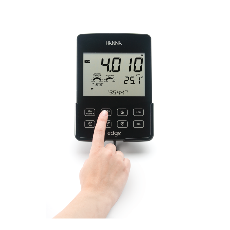 Cuando se usa con los electrodos de pH de Hanna equipados con un pin coincidente, el borde comprueba constantemente la impedancia del electrodo de medición de pH para notificarle en tiempo real en caso de rotura del vidrio. Durante la calibración, Sensor Check verifica el estado de la unión. La unión de referencia también se evalúa y se informa en la pantalla.