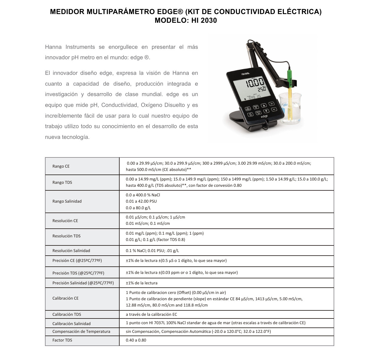 MEDIDOR DE CONDUCTIVIDAD – > MARCA: HANNA -> MODELO: HI2030 ; realizamos entrega en las ciudades de Lima, Arequipa, Cusco , Moquegua , Tacna , Ica , Chiclayo , Trujillo, Cajamarca, Piura, Tumbes, iquitos, Huancayo , Ayacucho , Pucallpa, Huanuco , Cerro de Pasco ; llevamos mas de 10 años comercializando HANNA en Peru , somos especialistas importando medidor de conductividad, medidor multiparametrico , medidor de conductividad de mesa, medidor de phMedidor de CE de mesa Edge HANNA – HI2030