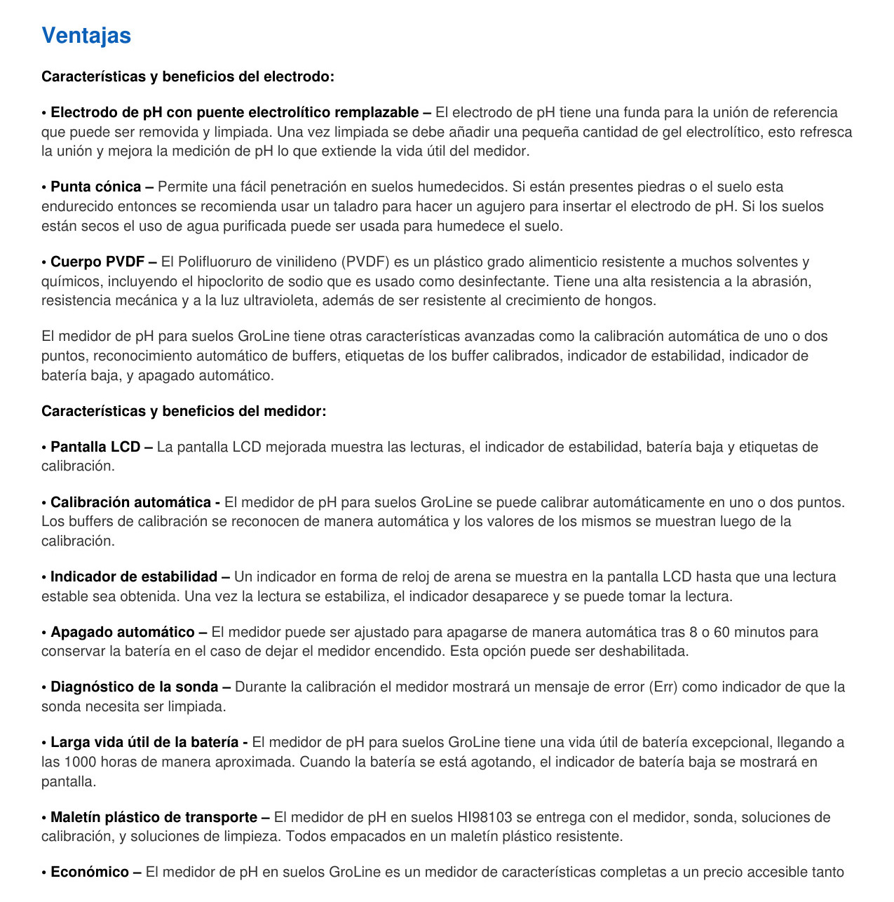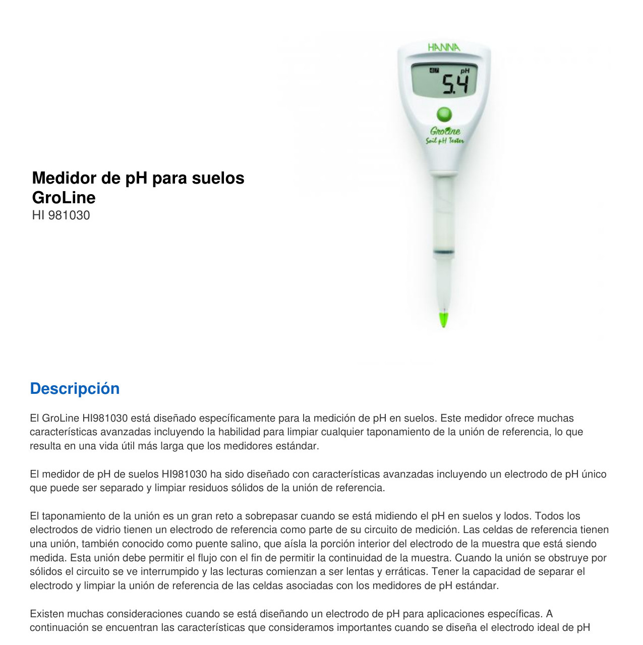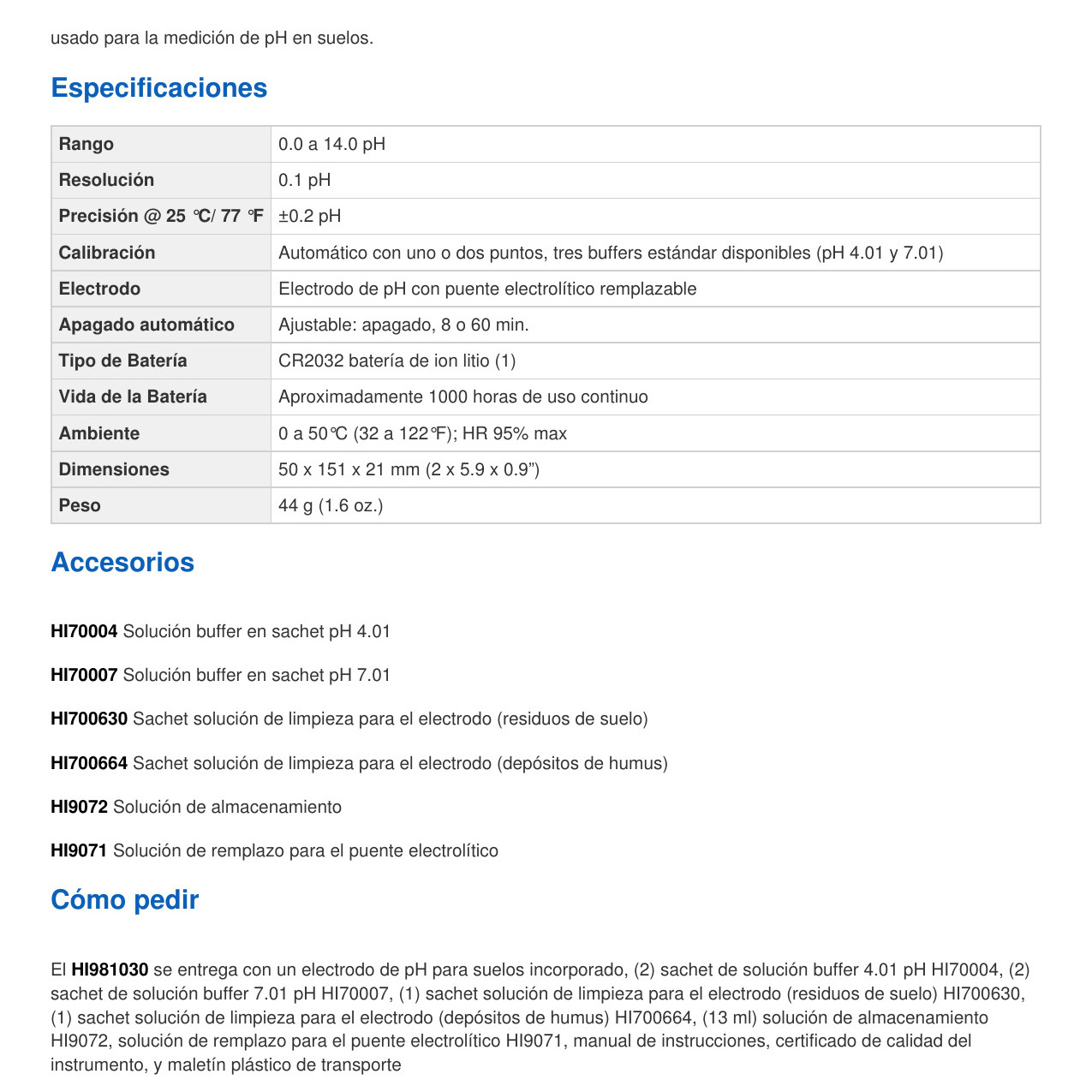 Información para ordenar El medidor de pH GroLine HI981030 se suministra con: • Sobre de solución de calibración de pH 4.01 (2 pzas.) • Sobre de solución de calibración de pH 7.01 (2 pzas.) • Solución de limpieza para depósitos de suelo • Solución de limpieza para depósitos de humus • Solución de almacenamiento y gotero de 13 mL • Solución de relleno de electrodos • Manual de instrucciones • Certificado de calidad.