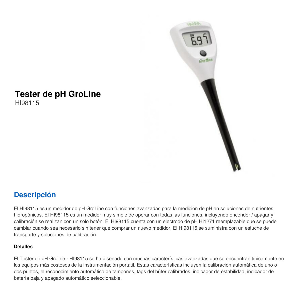 El medidor de pH cuenta con electrodo de pH reemplazable que puede cambiarse cuando sea necesario mediante sistema de rosca. Aunque el electrodo se pueda cambiar, siempre debe ser el mismo, el HI1271.