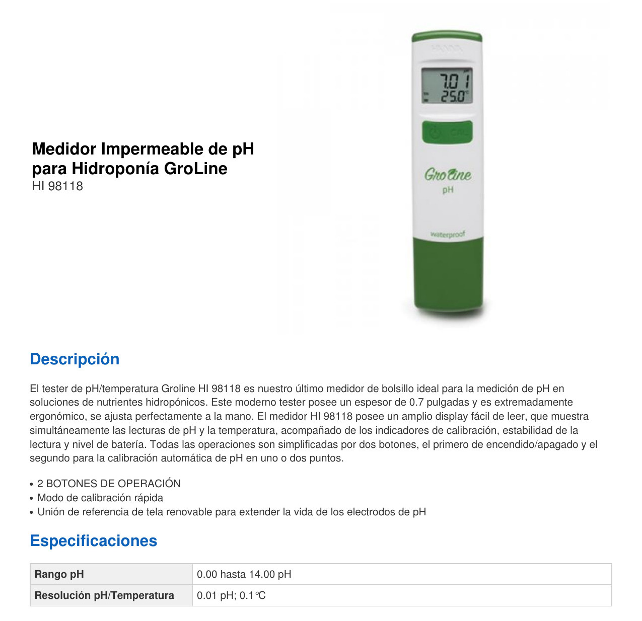 El medidor de pH/temperatura GroLine HI98118 es una forma económica de medir el pH de soluciones nutritivas hidropónicas. El mantenimiento de un pH óptimo es esencial para maximizar el crecimiento. La regla general es que a medida que el pH aumenta, la solubilidad de minerales y nutrientes disminuye. Es importante que los nutrientes sean solubles para la absorción y el uso de las plantas para el crecimiento. El pH de la solución nutritiva también puede afectar a las bacterias que fijan el nitrógeno que la planta usa. Cada planta tiene niveles óptimos de pH para el crecimiento. A continuación se muestra una tabla para el intervalo de pH ideal para una variedad de plantas.