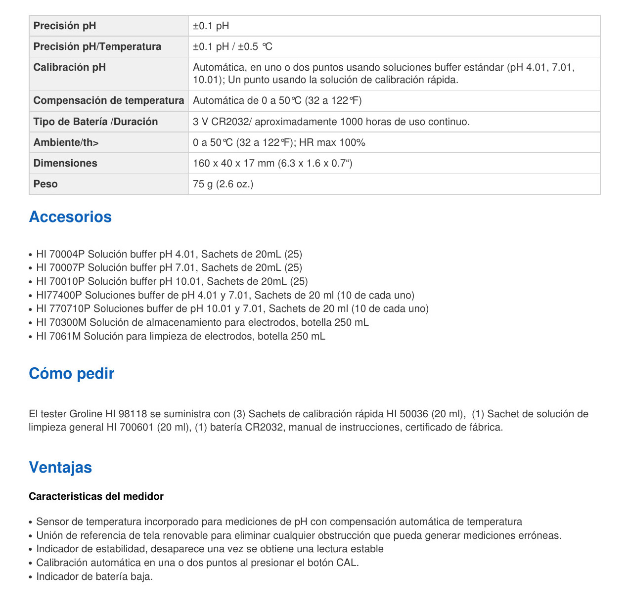 El HI98118 viene con 3 sobres de calibración Quick Cal HI50036 (20 mL), sobre de solución de limpieza de uso general HI700601 (20 mL) (1), (1) batería CR2032, manual de instrucciones y certificado de calidad. VIDEO REFRENCIAL: