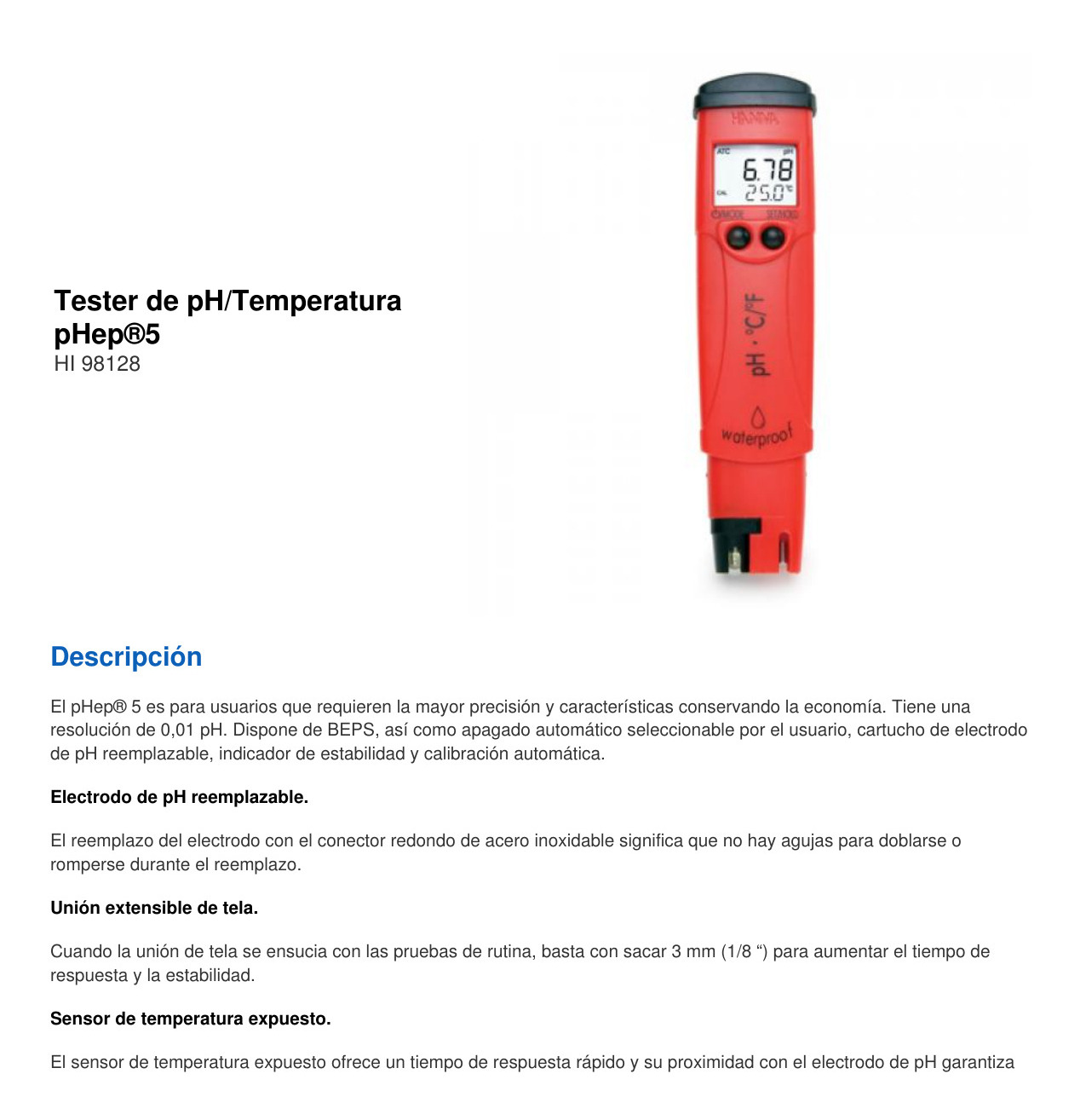 EL HI98128 (pHep®5) incluye un electrodo de pH HI73127 y una herramienta para quitar el electrodo HI73128, baterías e instrucciones. VIDEO REFRENCIAL: