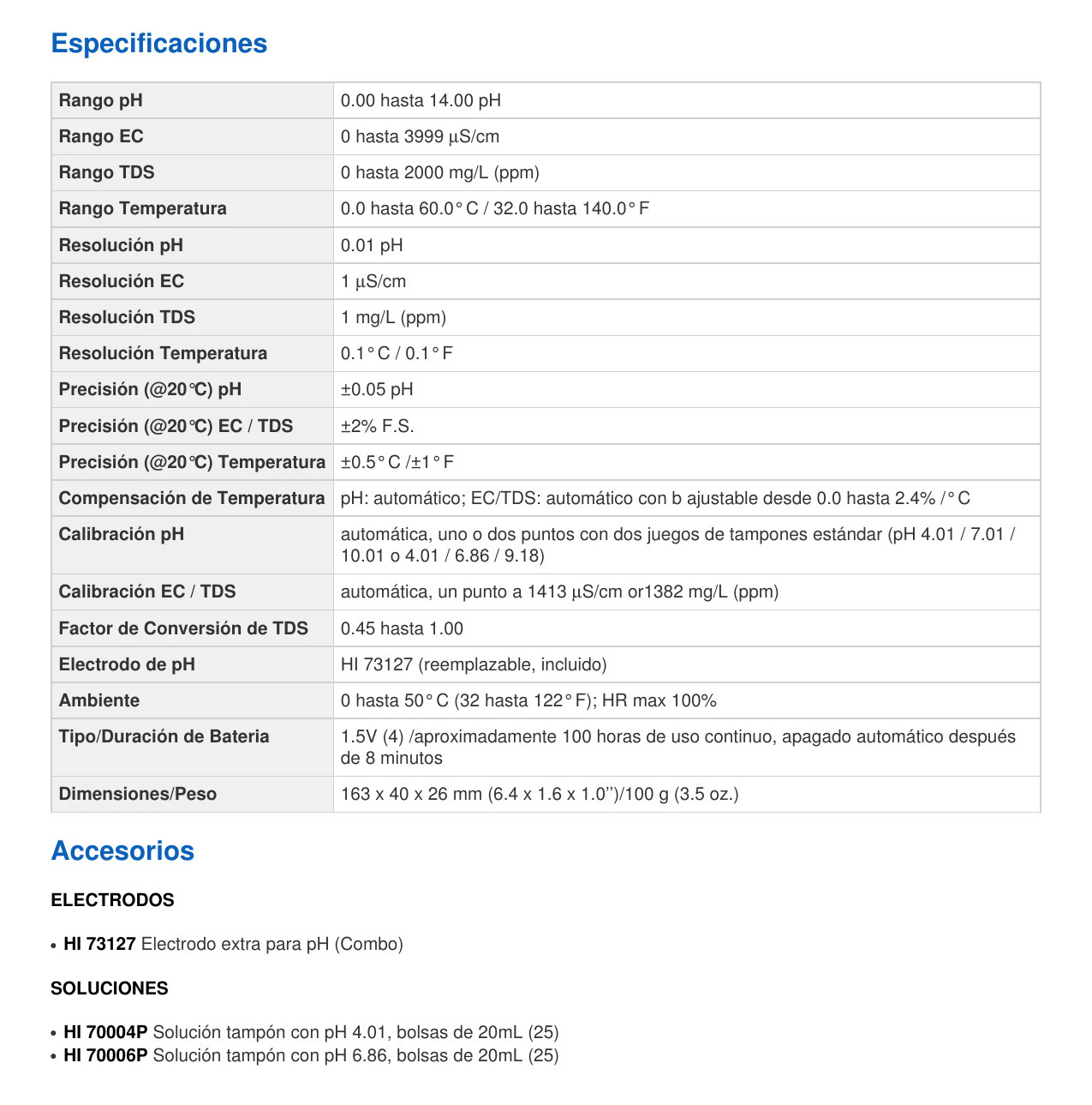 Todas las lecturas de pH y CE/TDS tienen compensación automática de temperatura (ATC), y los valores temperatura pueden mostrarse en pantalla en unidades°C or °F.