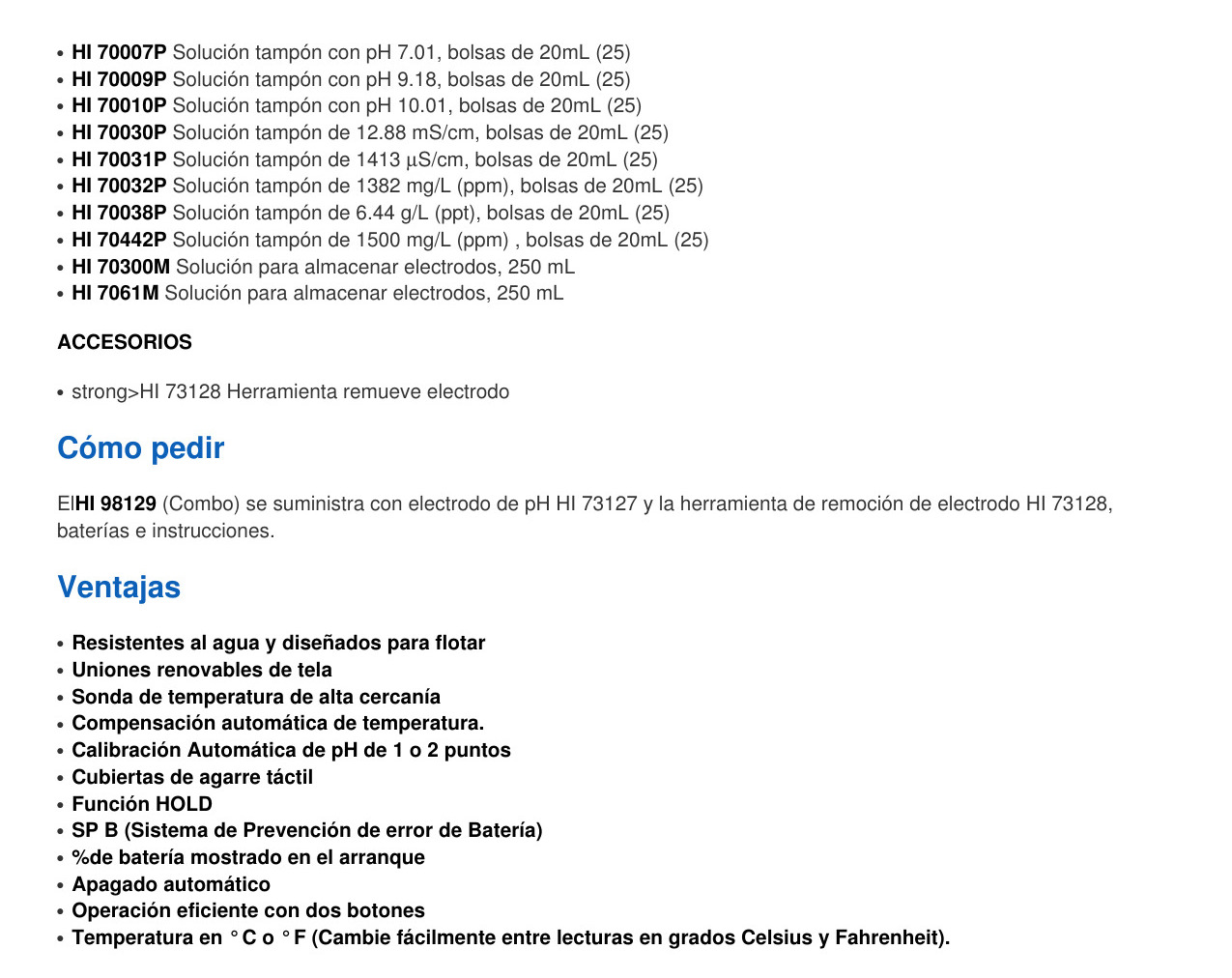 El medidor de pH ,Ec,TDS,ºC (HI 98129) puede ser calibrado a uno o dos puntos para pH (con reconocimiento automático de tampón y cinco valores tampón memorizados), y a un punto para CE/TDS.