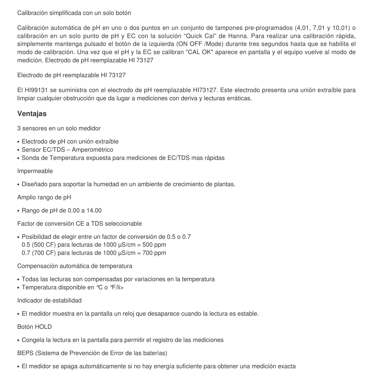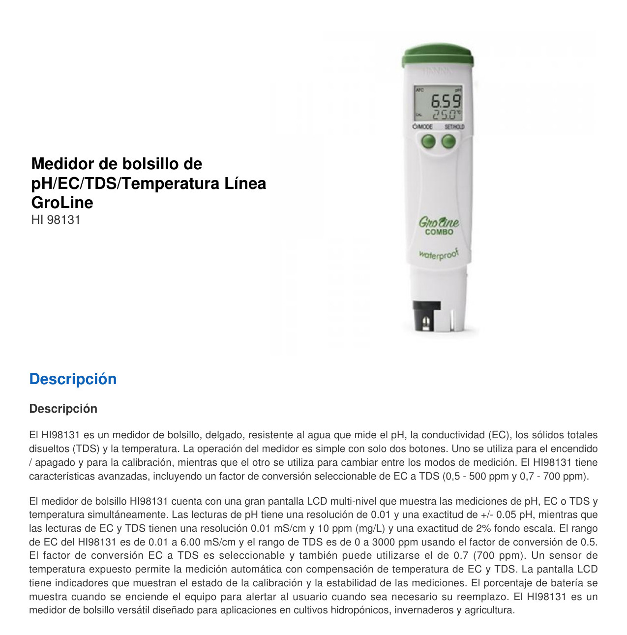 -El medidor HI98131 de la línea GroLine cuenta con una gran pantalla LCD de varios niveles que muestra el pH, CE o TDS y lecturas de temperatura simultáneamente. Las lecturas de pH se muestran con una resolución de 0.01 y con una exactitud de +/- 0.05 pH, mientras que las lecturas de CE y TDS se muestran con una resolución de 0.01 mS / cm y 10 ppm (mg/L) y exactitud del 2% a escala completa. El intervalo CE del HI98131 es de 0.01 a 6.00 mS/cm y el de TDS es de 0 a 3,000 ppm usando un factor de conversión de 0.5. El HI98131 también ofrece la opción de usar un factor de conversión de CE a TDS de 0.7 (700 ppm). Un sensor de temperatura en contacto conla muestra permite mediciones rápidas compensadas por temperatura de CE y TDS. La pantalla LCD tiene indicadores para el estado de calibración y la estabilidad. El nivel de porcentaje de la batería se muestra al arrancar el medidor, alertando al usuario de la energía restante de la batería que está disponible. El HI98131 es un medidor de bolsillo versátil diseñado para aplicaciones de hidroponía, invernadero y agricultura.