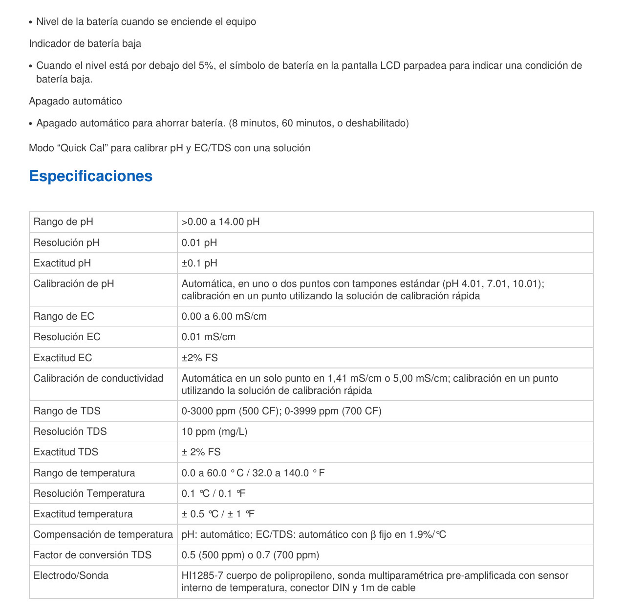 Compensación de temperatura pH: automática; CE/TDS: automática con β set a 1.9%/°C