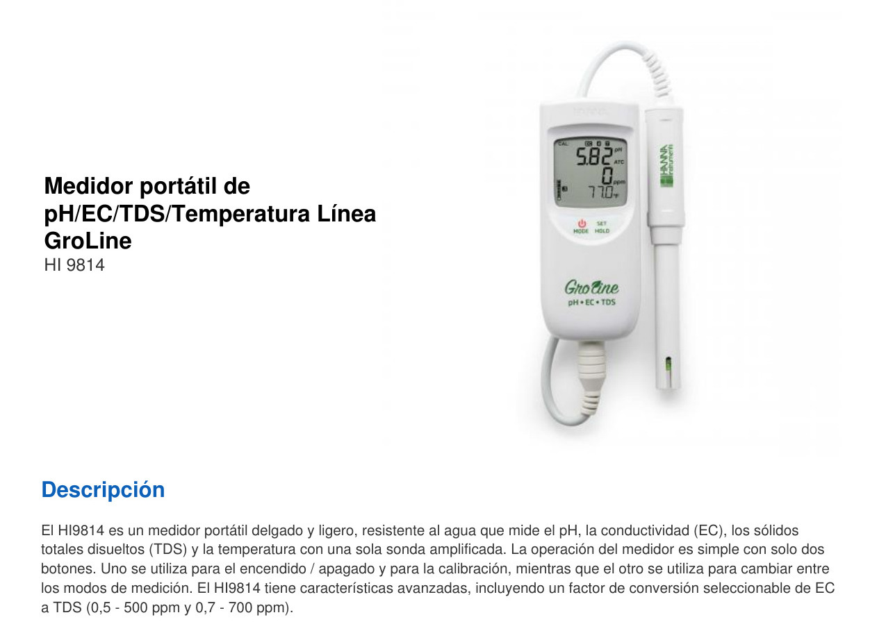 Diseñado para aportar simplicidad a las pruebas de nutrientes, el medidor portátil de bajo consumo HI9814 está diseñado específicamente para cultivadores hidropónicos. El electrodo especializado combina 3 sensores en una única sonda resistente con cuerpo de polipropileno, sensor de temperatura integrado y unión de tela.
