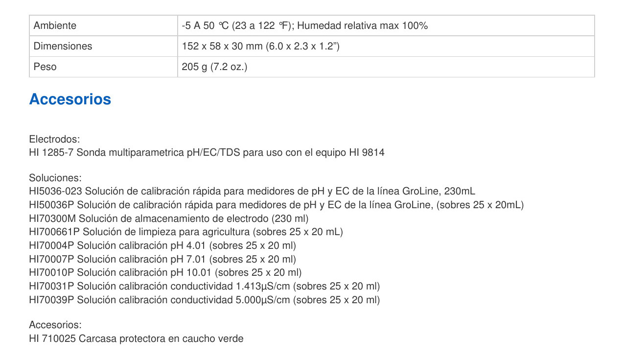 Información sobre pedidos HI9814 se suministra con la sonda multiparamétrica HI1285-7, el sobre de solución tampón Quick Cal HI50036-0 (3), el sobre de solución de limpieza de electrodos de pH HI700661 para agricultura (3), las baterías 1.5 AAA (3) y las instrucciones.