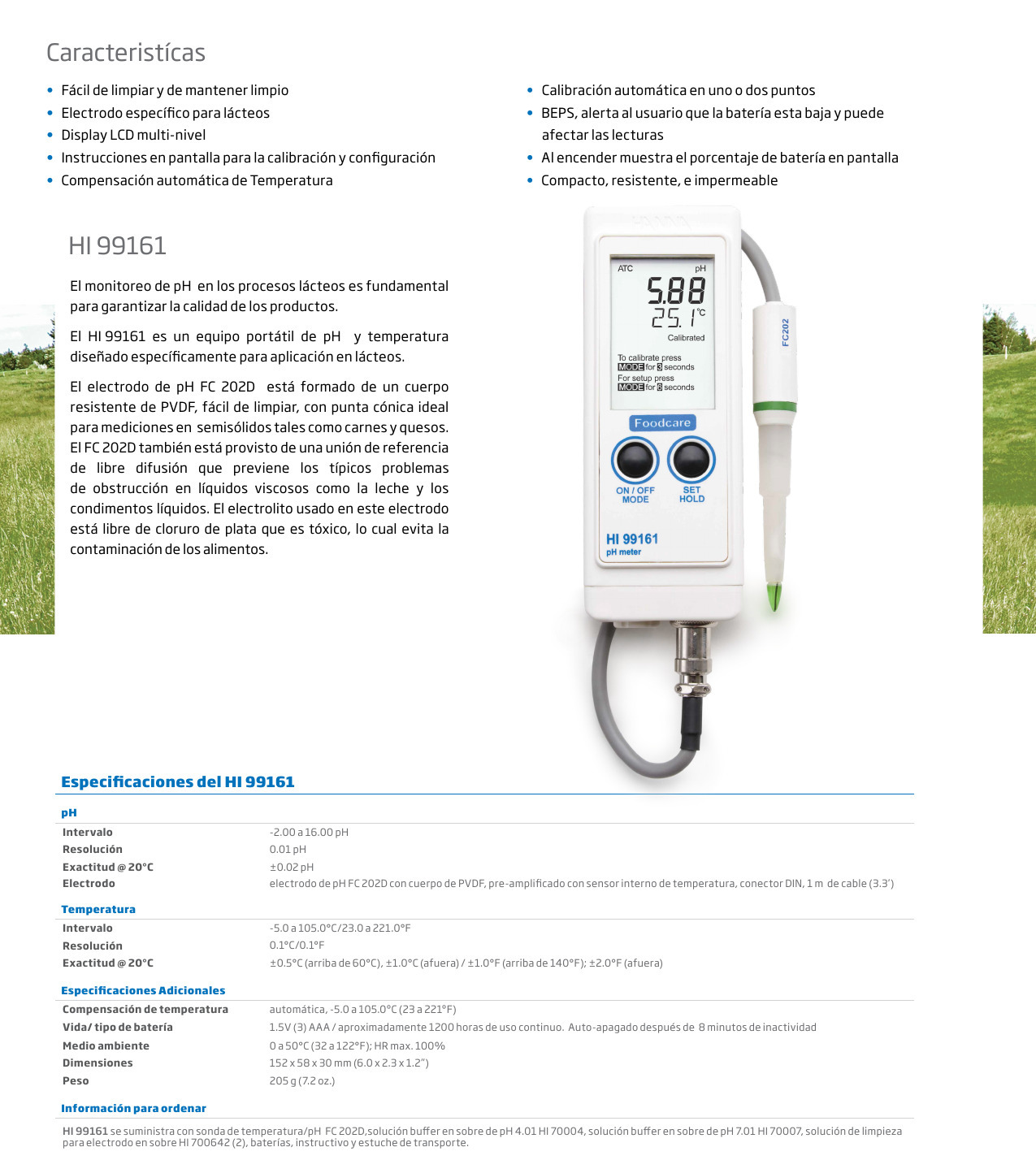 Información sobre pedidos HI99161 se suministra con FC202D pH / temperatura sonda, HI70004 pH 4.01 paquete de solución tampón (20 ml), HI70007 pH 7.01 paquete de solución tampón (20 ml), HI700642 bolsita de solución de limpieza de electrodos (2 x 20 ml), baterías, instrucciones y duro estuche de transporte. VIDEO REFRENCIAL: