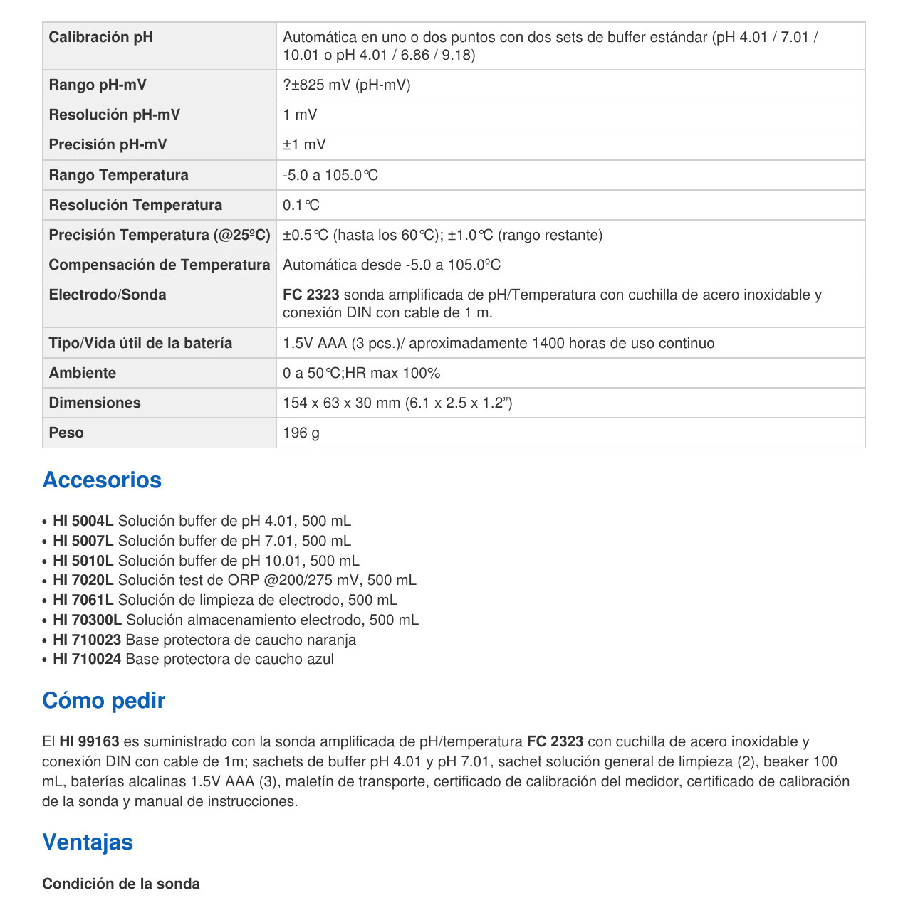 Calibración Uno o dos puntos de calibración, dos juegos de buffers estándares disponibles (4.01, 7.01, 10.01 o NIST 4.01, 6.86, 9.18)