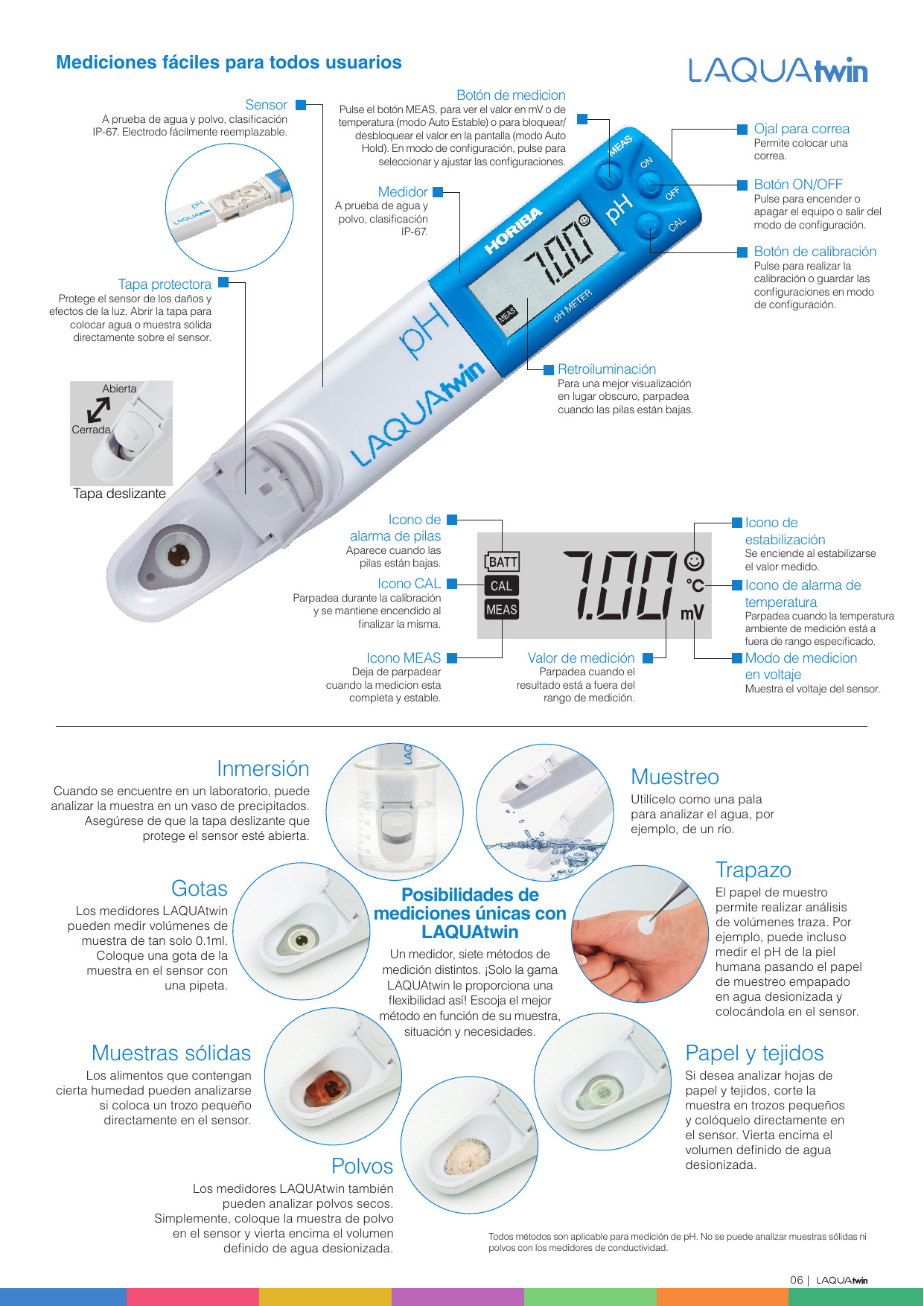 LAQUAtwin pH-11 es un medidor de pH a prueba de agua con una gran pantalla LCD con retroiluminación. Este equipo incorpora un electrodo plano, único en el mundo diseñado con la última tecnología HORIBA para la medición de micro volumen. El electrodo reemplazable hace uso del mismo principio de medición que el electrodo de vidrio tradicional; sin embargo, el pH-11 tan solo requiere unas gotas (0,1 ml) para ofrecer un análisis rápido y preciso.