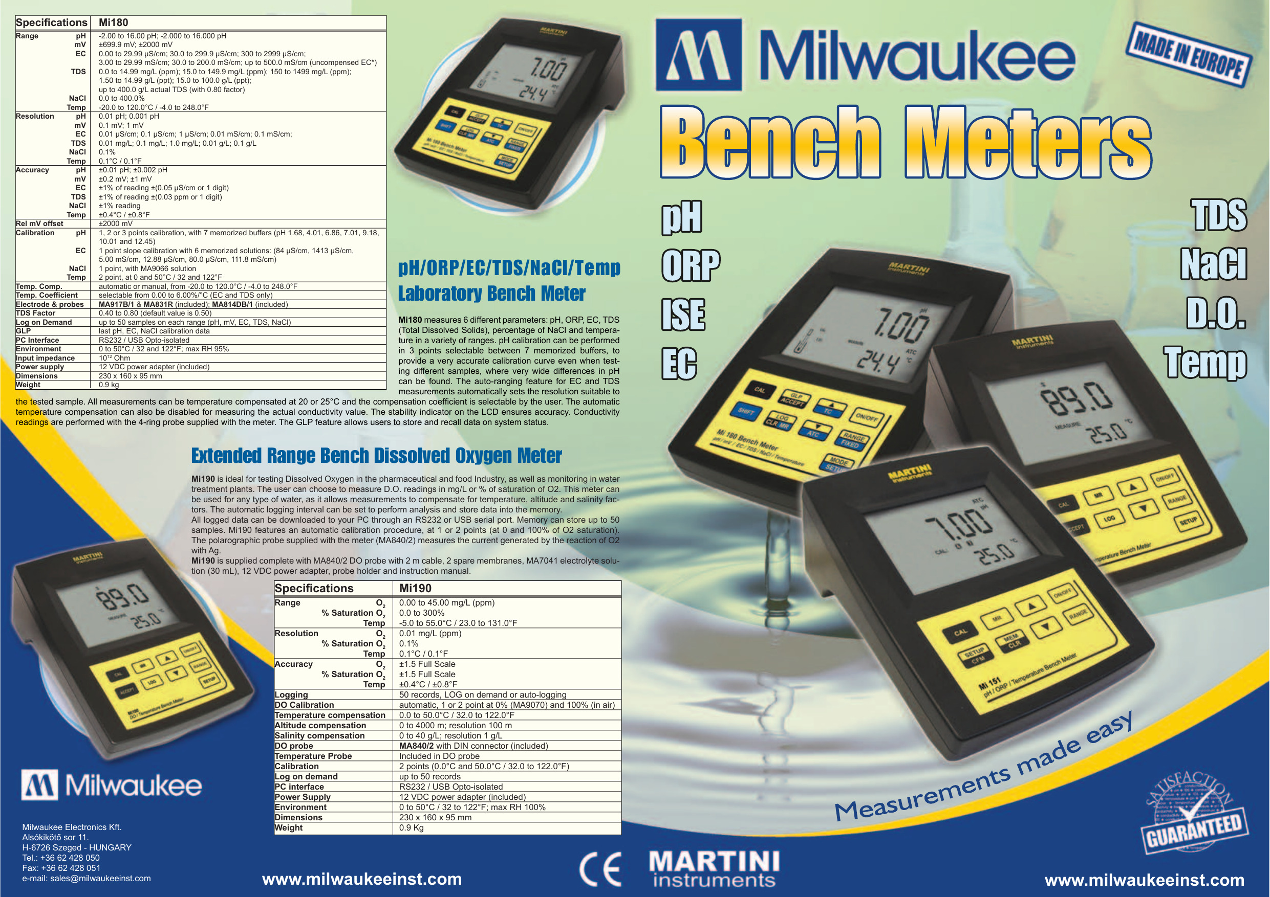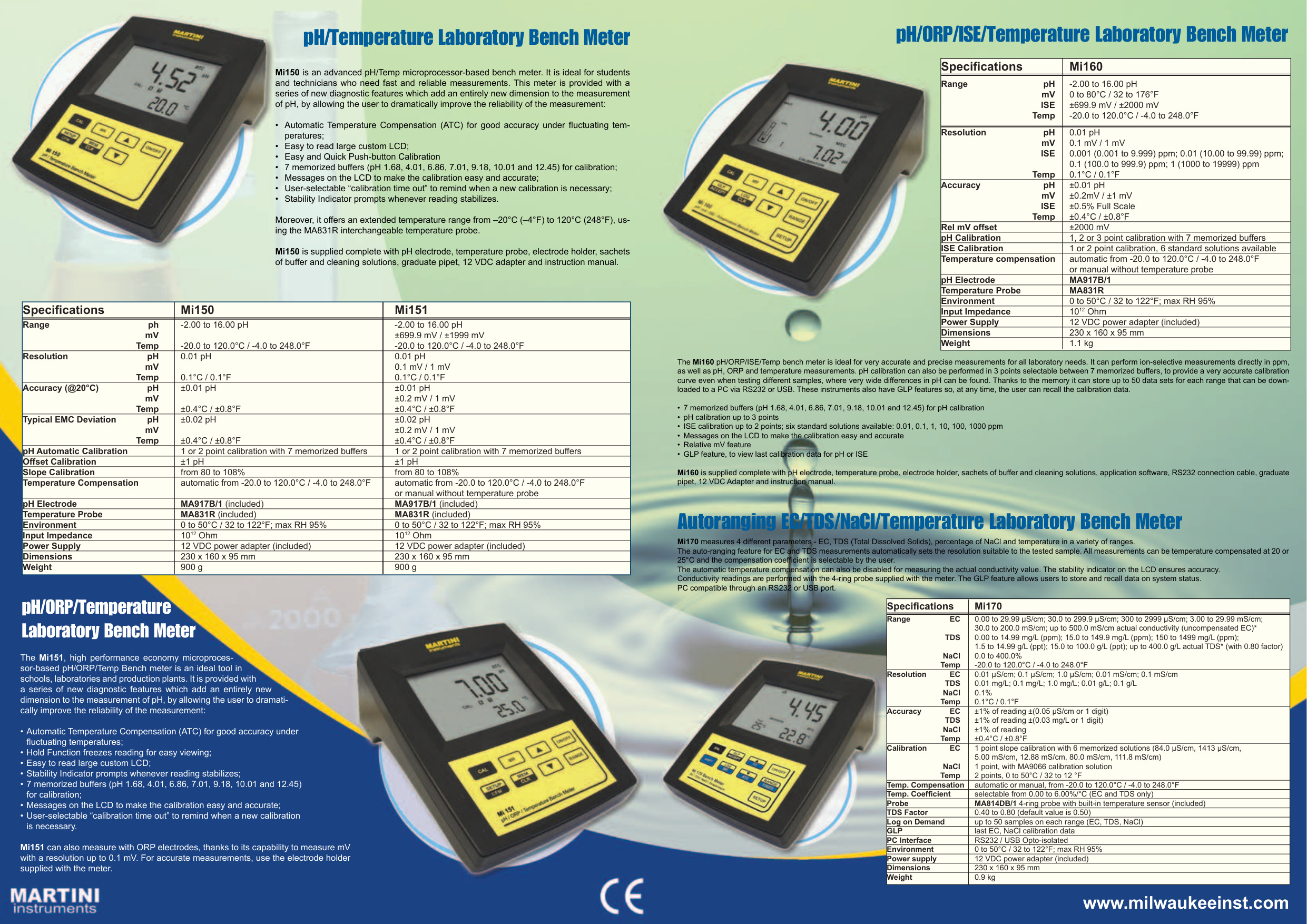 Mi180 mide 6 parámetros diferentes: pH, ORP, EC, TDS (Sólidos Disueltos Totales), porcentaje de NaCl y temperatura en una variedad de rangos.