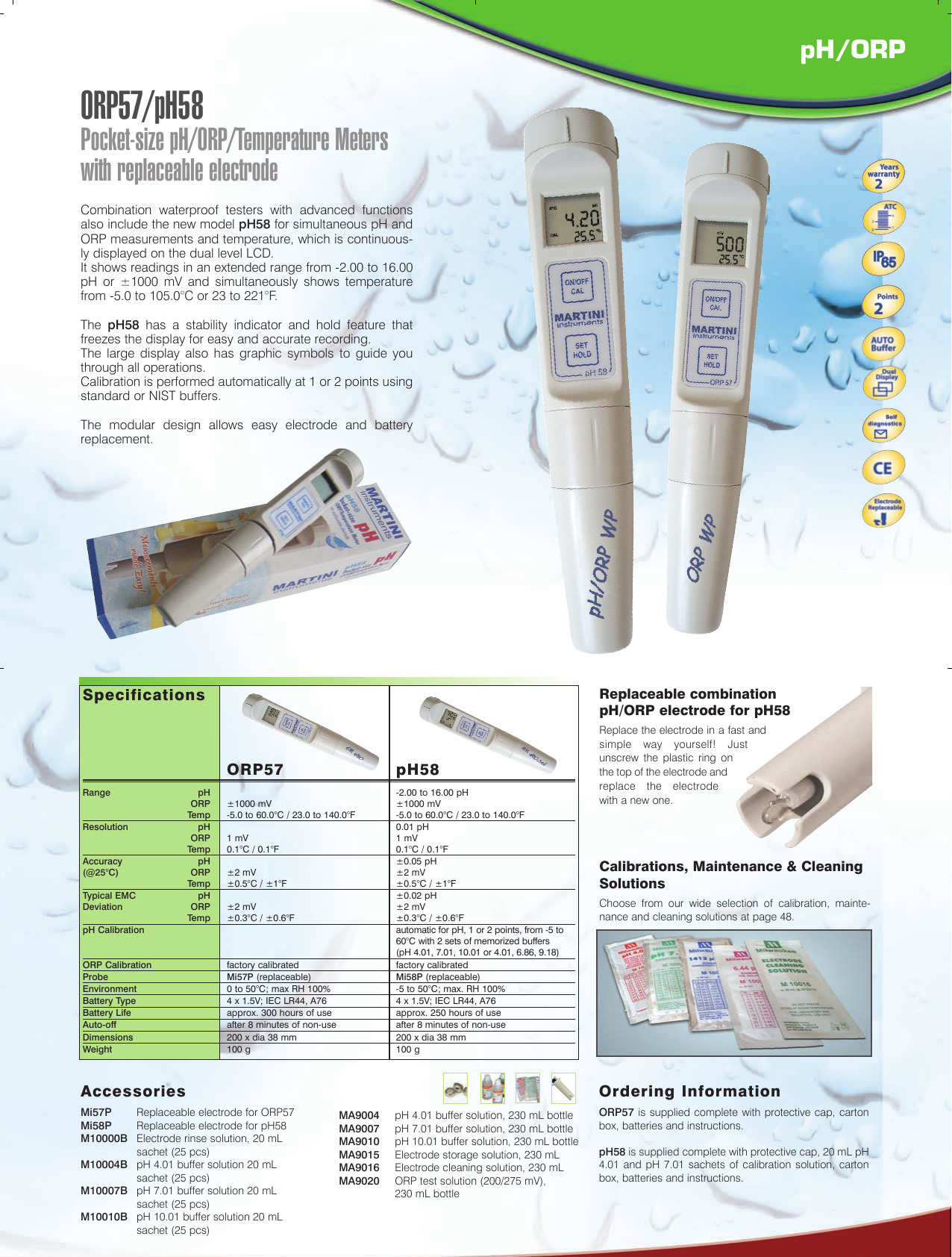 El medidor de pH y temperatura pH58mide con compensación de temperatura automática con un rango extendido de pH -2.0 a 16.0 y simultáneamente muestra temperatura de -5.0°C a 105.0°C o de 23.0°F a 221.0°F. Tamibén mide el ORP (mV: +/- 1000).