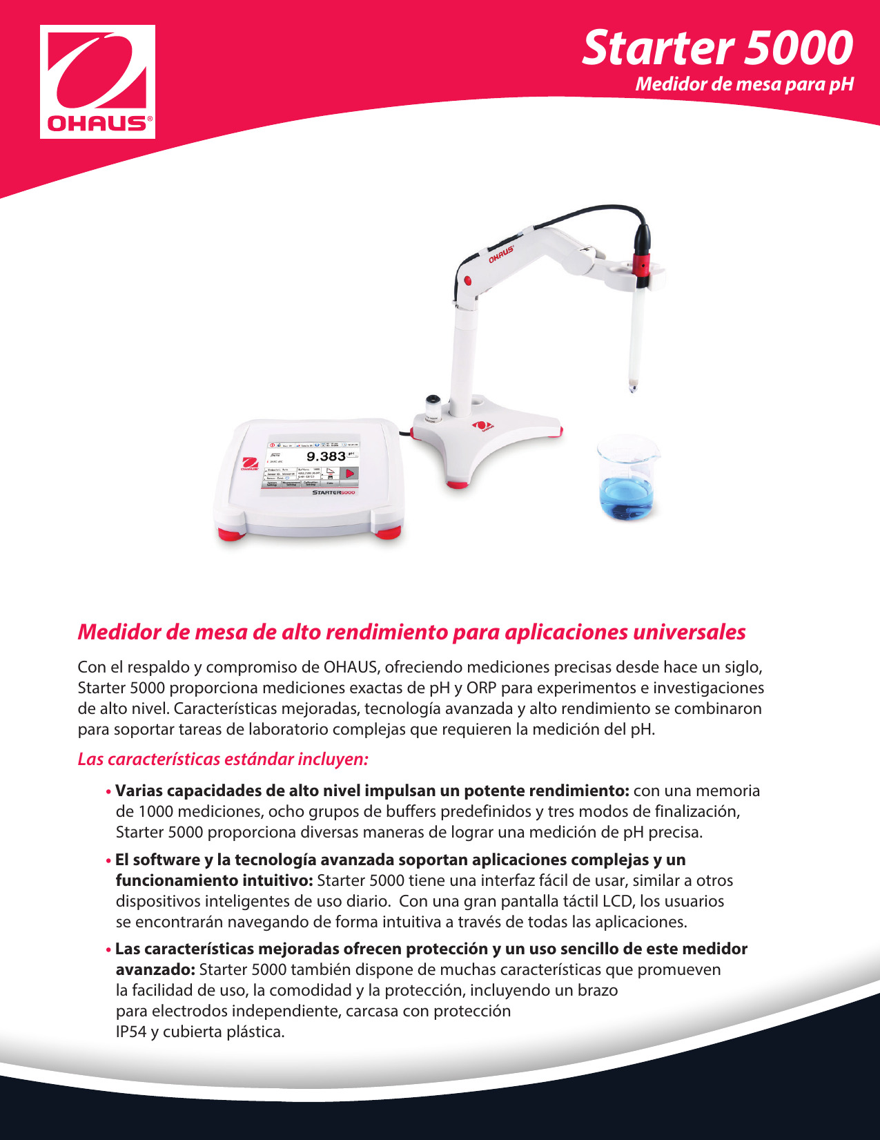 Medidor de banco de alto rendimiento para aplicaciones universales de pH. El Ohaus Starter 5000 proporciona mediciones precisas de pH y ORP para experimentos e investigaciones de alto nivel. Con una memoria de 1.000 mediciones, ocho grupos de búferes predefinidos y tres modos de punto final, el Starter 5000 proporciona varias formas de lograr una medición precisa del pH. ST5000 tiene una interfaz fácil de usar, similar a otros dispositivos inteligentes que se utilizan a diario. Con una gran pantalla LCD táctil de 4.3 “, los usuarios se encontrarán navegando intuitivamente a través de todas las aplicaciones.