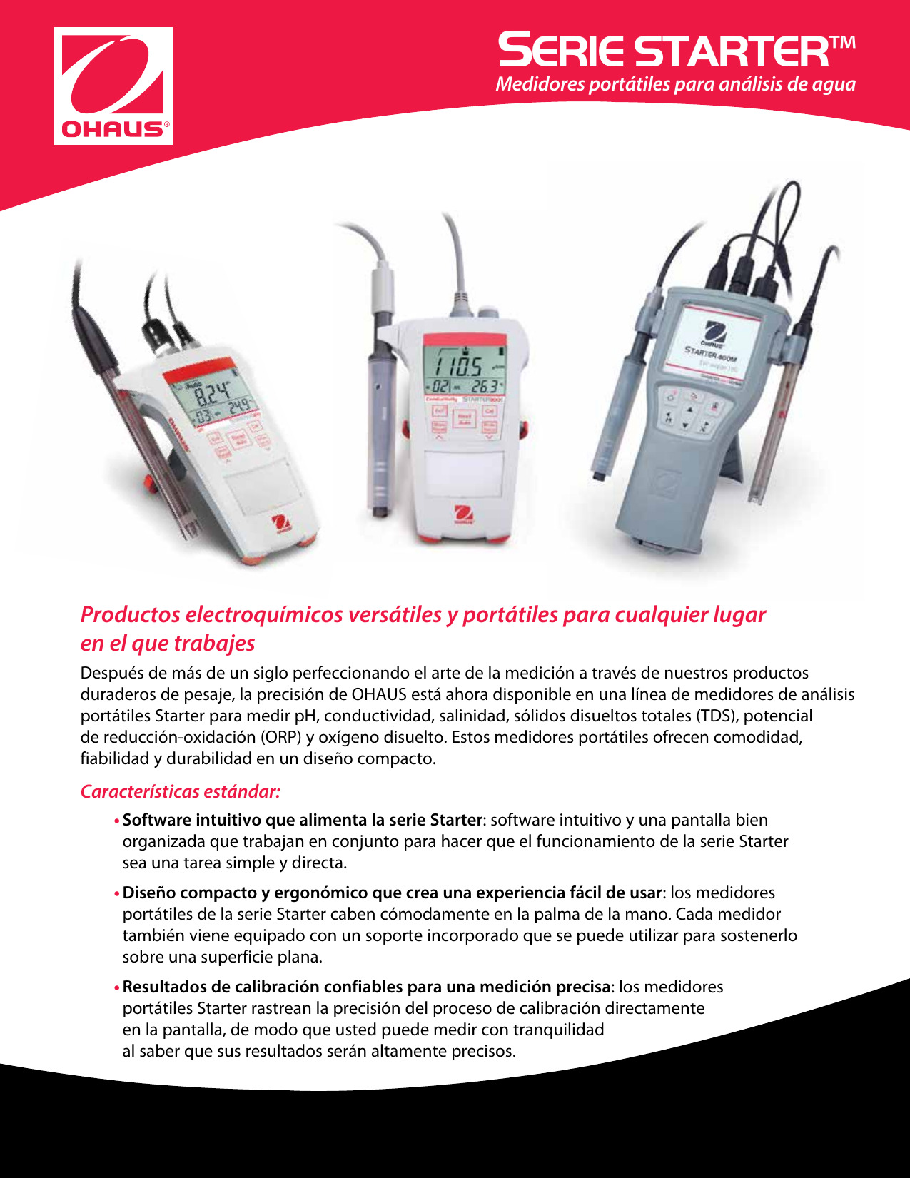 Características del Diseño: Compensación de temperatura automática y manual, reconocimiento automático de buffer, ícono de calibración