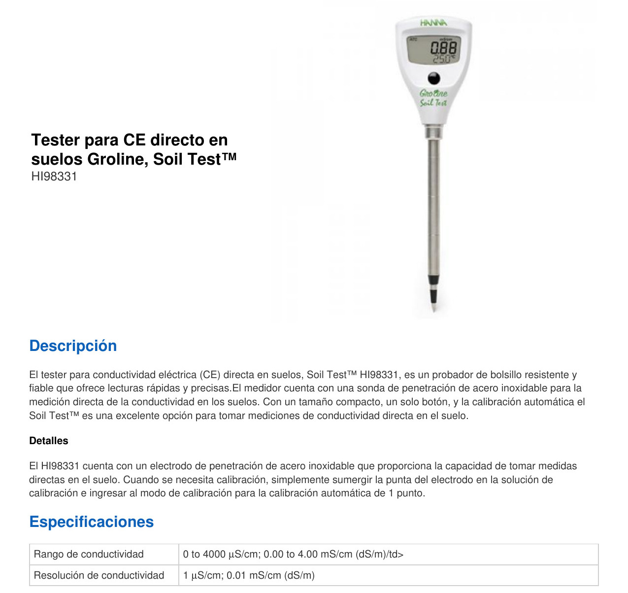 MEDIDOR DE TEMPERATURA – > MARCA: HANNA -> MODELO: HI98331 ; realizamos entrega en las ciudades de Lima, Arequipa, Cusco , Moquegua , Tacna , Ica , Chiclayo , Trujillo, Cajamarca, Piura, Tumbes, iquitos, Huancayo , Ayacucho , Pucallpa, Huanuco , Cerro de Pasco ; llevamos mas de 10 años comercializando HANNA en Peru , somos especialistas importando medidor de temperatura, medidor de conductividad , medidor de conductividad electrica para suelos, conductimetro para suelosMedidor de Conductividad y Temperatura para suelo Groline HANNA – HI98331