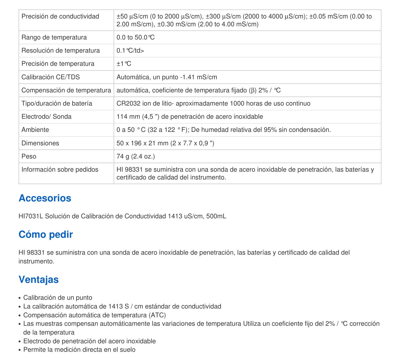 Información sobre pedidos HI98331 se suministra con una sonda de penetración de acero inoxidable, batería CR2032 (1 pieza), funda de almacenamiento / protección, manual de instrucciones y certificado de calidad.