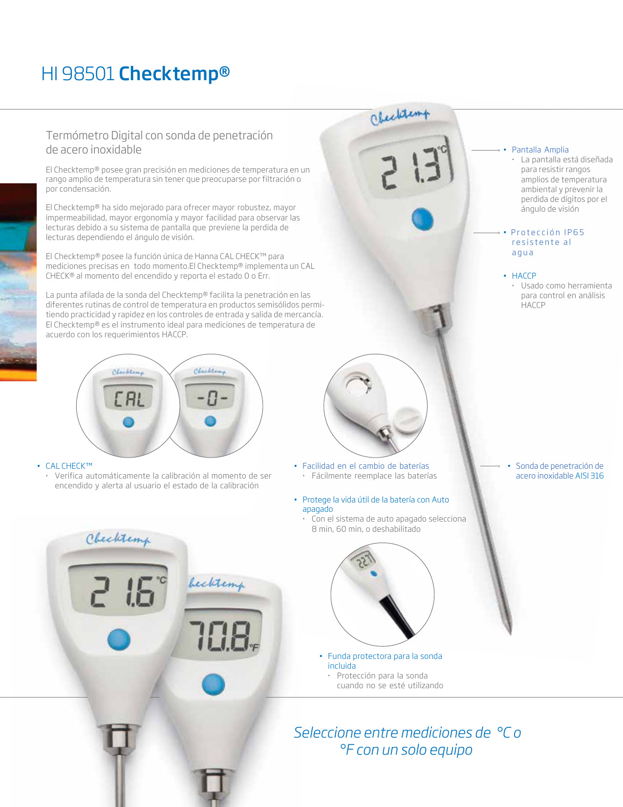 Información sobre pedidos HI 98501 (Checktemp®) se suministra con sonda de penetración, tapa protectora, batería e instrucciones.