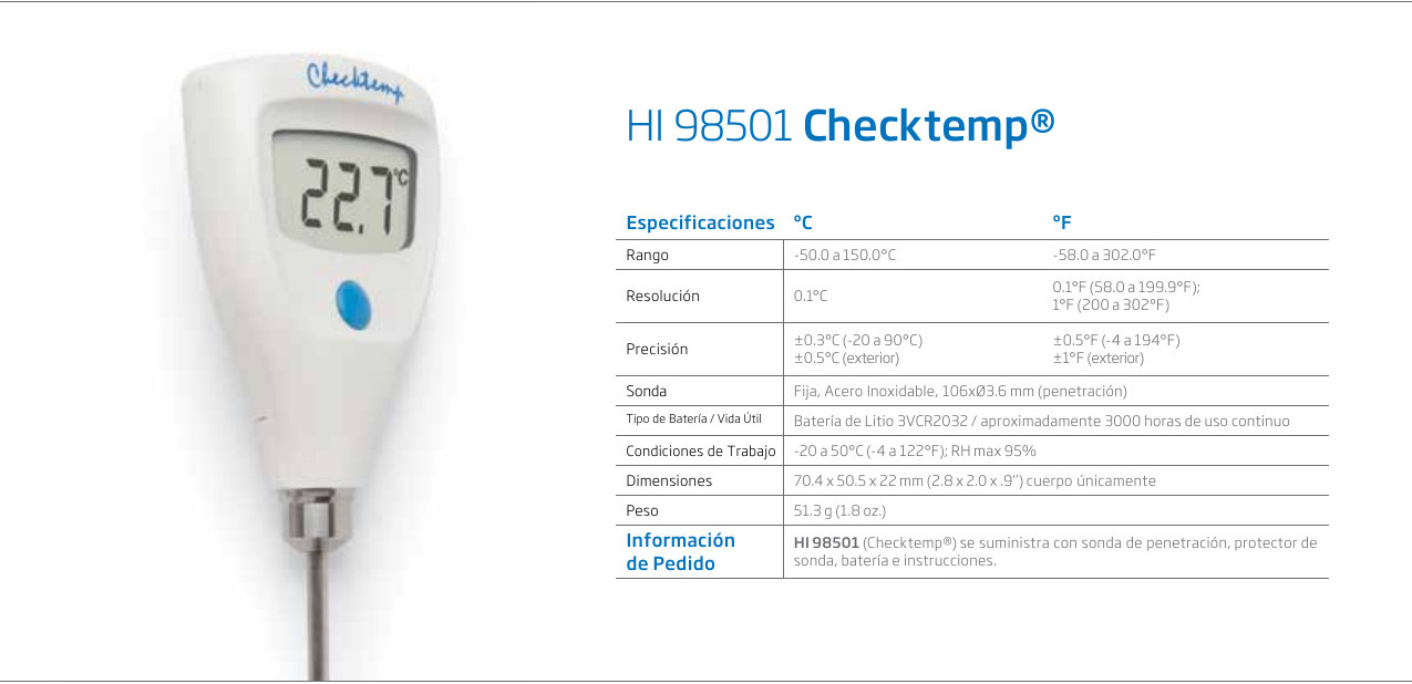 El HI 98501 Checktemp® es un termómetro digital con sonda de penetración de acero inoxidable. Ofrece mediciones de temperatura de alta precisión en un amplio rango de temperatura sin preocuparse por la rotura o la condensación.
