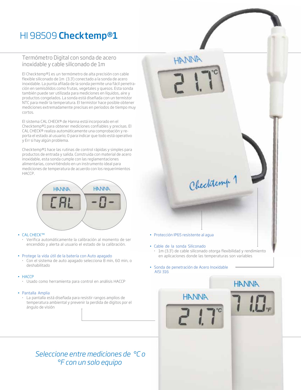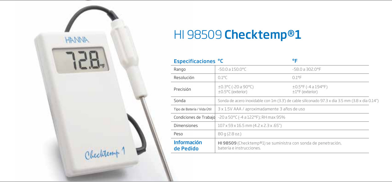 Información para ordenar HI 98509 (Checktemp®1) se suministra con sonda de penetración, cable de silicón de 3.3′, baterías y manual de instrucciones.