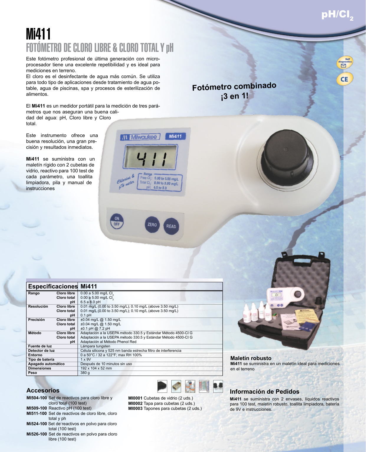Milwaukee Instruments ha desarrollado el Mi411, un instrumento portátil basado en microprocesador que mide tres parámetros críticos para garantizar una buena calidad del agua: pH, cloro libre y cloro total.