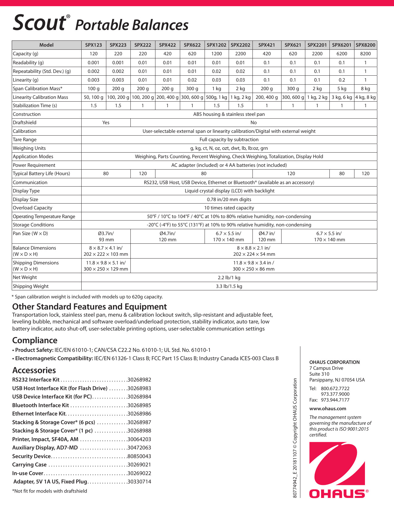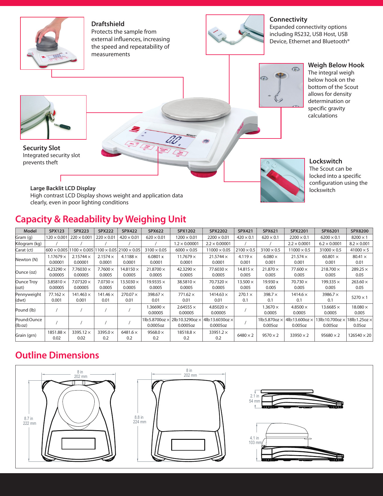 Características adicionales de Scout: bloqueo de transporte, interruptor de bloqueo de menú y calibración, pies antideslizantes y ajustables, burbuja de nivelación, protección de sobrecarga / sobrecarga mecánica y de software, Balanza portátil OHAUS Scout SPXindicador de estabilidad , tara automática, indicador de batería baja, apagado automático, seleccionable por el usuario Opciones de impresión, ajustes de comunicación seleccionables por el usuario.