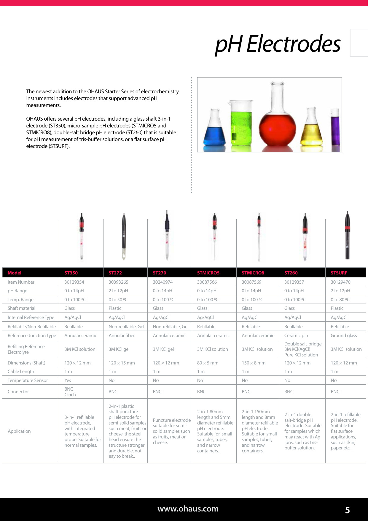 Todos los electrodos encajan perfectamente en los portaelectrodos de los medidores de mesa OHAUS y los clips del electrodo en todos los medidores portátiles de OHAUS
