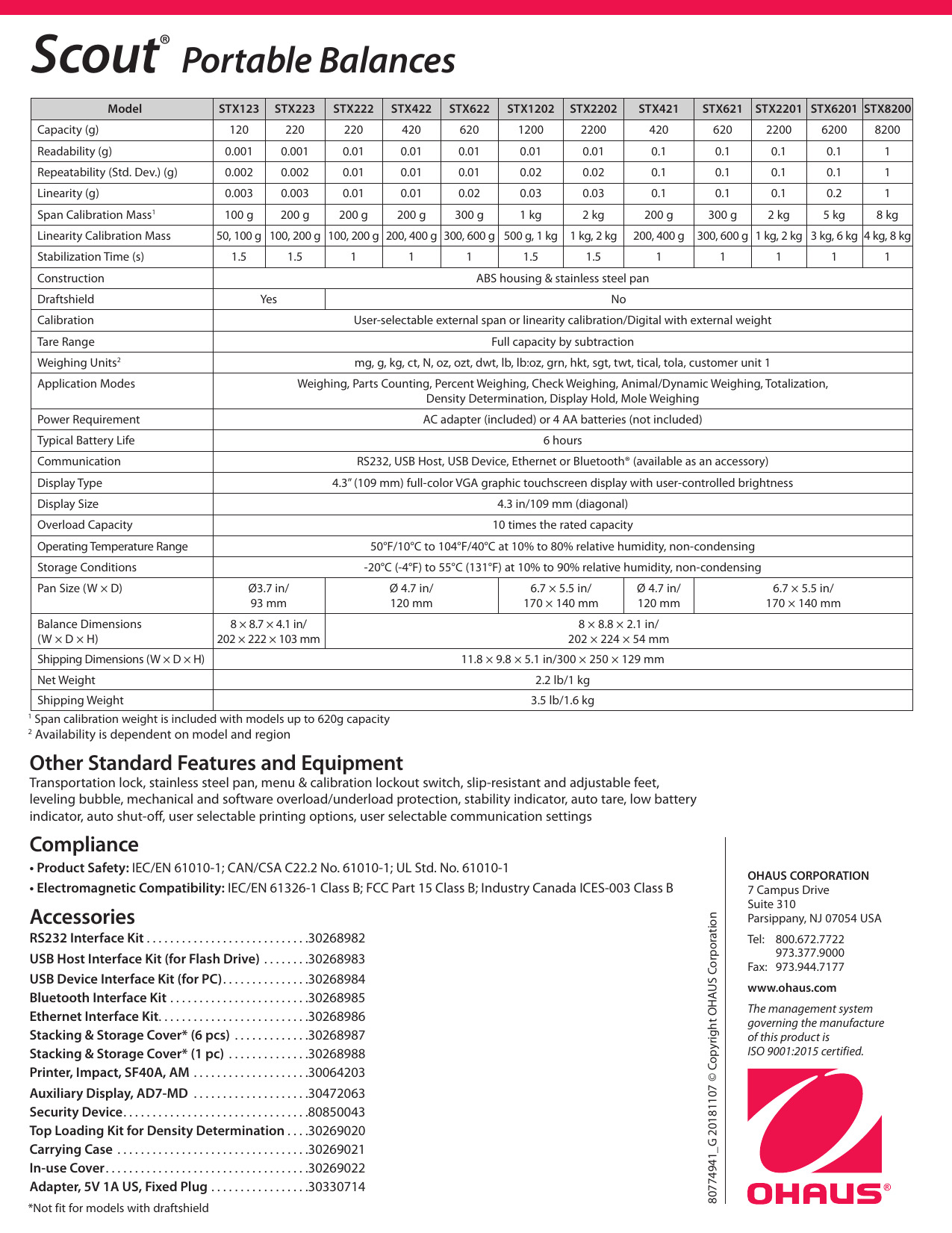 Características adicionales de Scout STX: bloqueo de transporte, interruptor de bloqueo de menú y calibración, pies antideslizantes y ajustables, burbuja niveladora, protección de sobrecarga / sobrecarga mecánica y de software, indicador de estabilidad, tara automática, indicador de batería baja, apagado automático, seleccionable por el usuario Opciones de impresión, ajustes de comunicación seleccionables por el usuario.