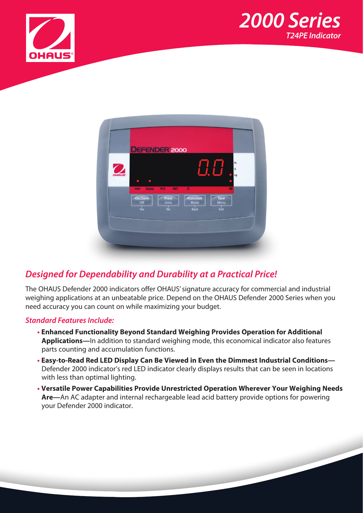 Los indicadores OHAUS de la Defender 2000 ofrecen la exactitud que representa a OHAUS para aplicaciones de pesaje comerciales e industriales a un precio inmejorable. Confíe en la serie Defender 2000 de OHAUS cuando necesite obtener exactitud confiable y a la vez maximizar su presupuesto.