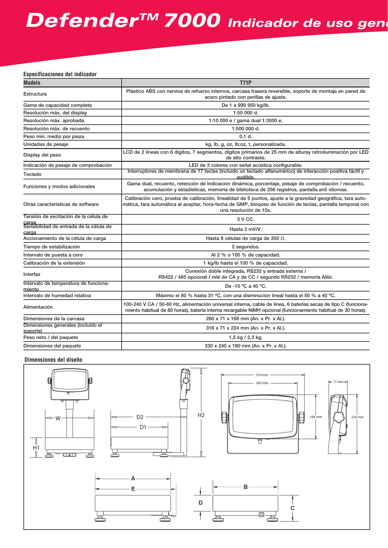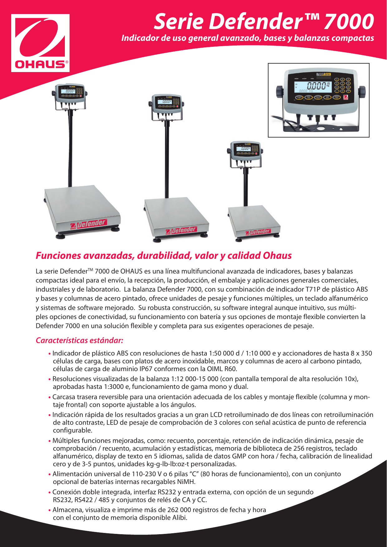 La serie de indicadores multifuncionales OHAUS 7000 es ideal para una amplia gama de aplicaciones en áreas de producción, empaque, almacén, inventario, envío y recepción. La serie 7000, ideal para uso en bancos y básculas de piso, está disponible tanto en una carcasa de plástico ABS de uso en seco como en una carcasa de acero inoxidable resistente al agua NEMA4X / IP66. Ambas carcasas tienen pantallas retroiluminadas de doble línea grandes y brillantes, teclas táctiles elevadas, uso con pilas (opcional en T71XW), y son fáciles de configurar y usar. La serie 7000 es la solución para sus aplicaciones de indicadores de pesaje que requieren múltiples funciones, construcción robusta, software completo pero intuitivo y múltiples opciones de conectividad.