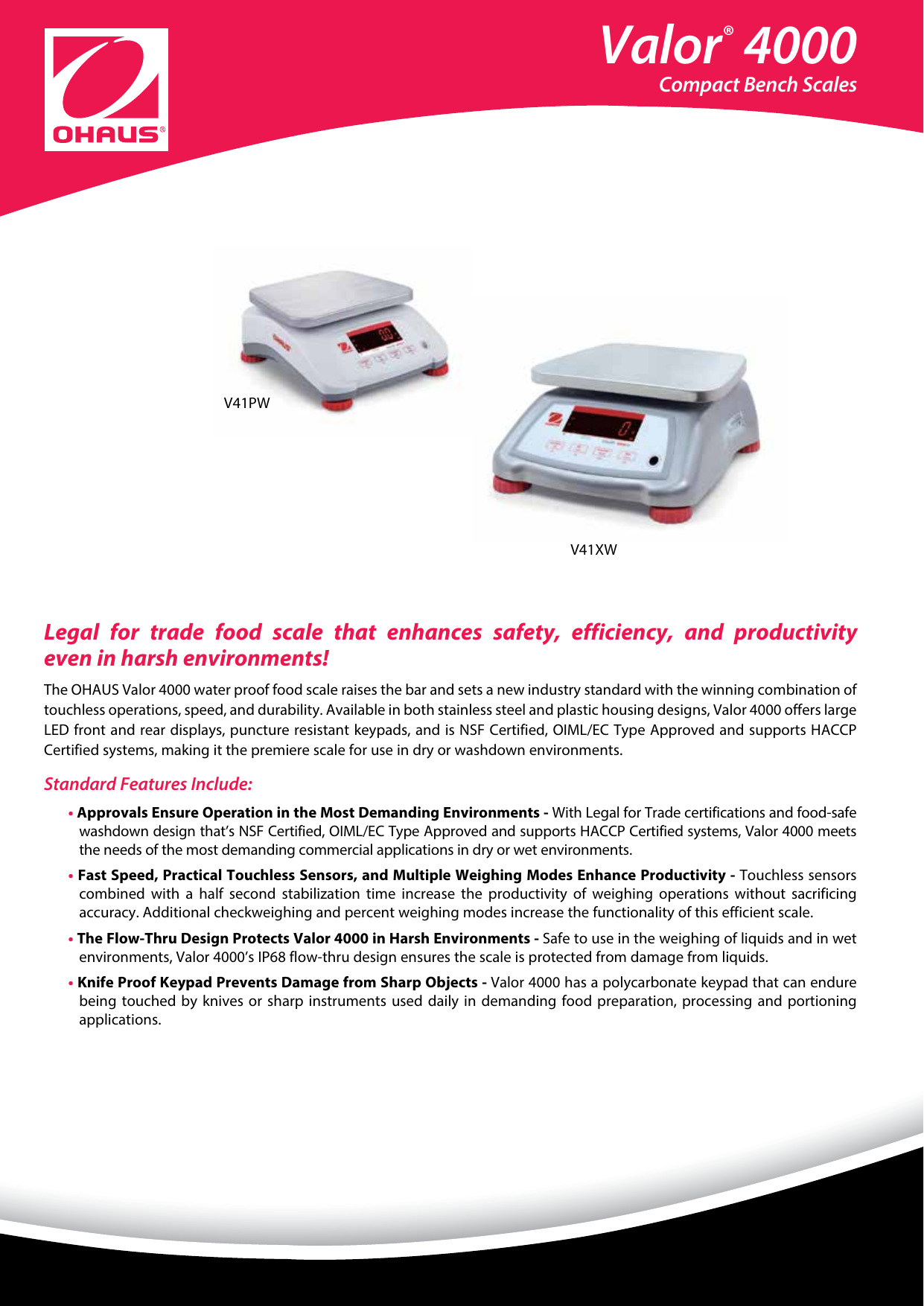 Las básculas de mesa compactas resistentes al agua OHAUS Valor 4000 combinan durabilidad, velocidad y operaciones sin contacto para proporcionar una solución ideal para los procesos de pesaje de alimentos. Valor 4000 viene de serie con pantallas LED delanteras y traseras, seguridad alimentaria y legal para aprobaciones comerciales, teclados resistentes a pinchazos y opciones de carcasa de plástico y acero inoxidable.