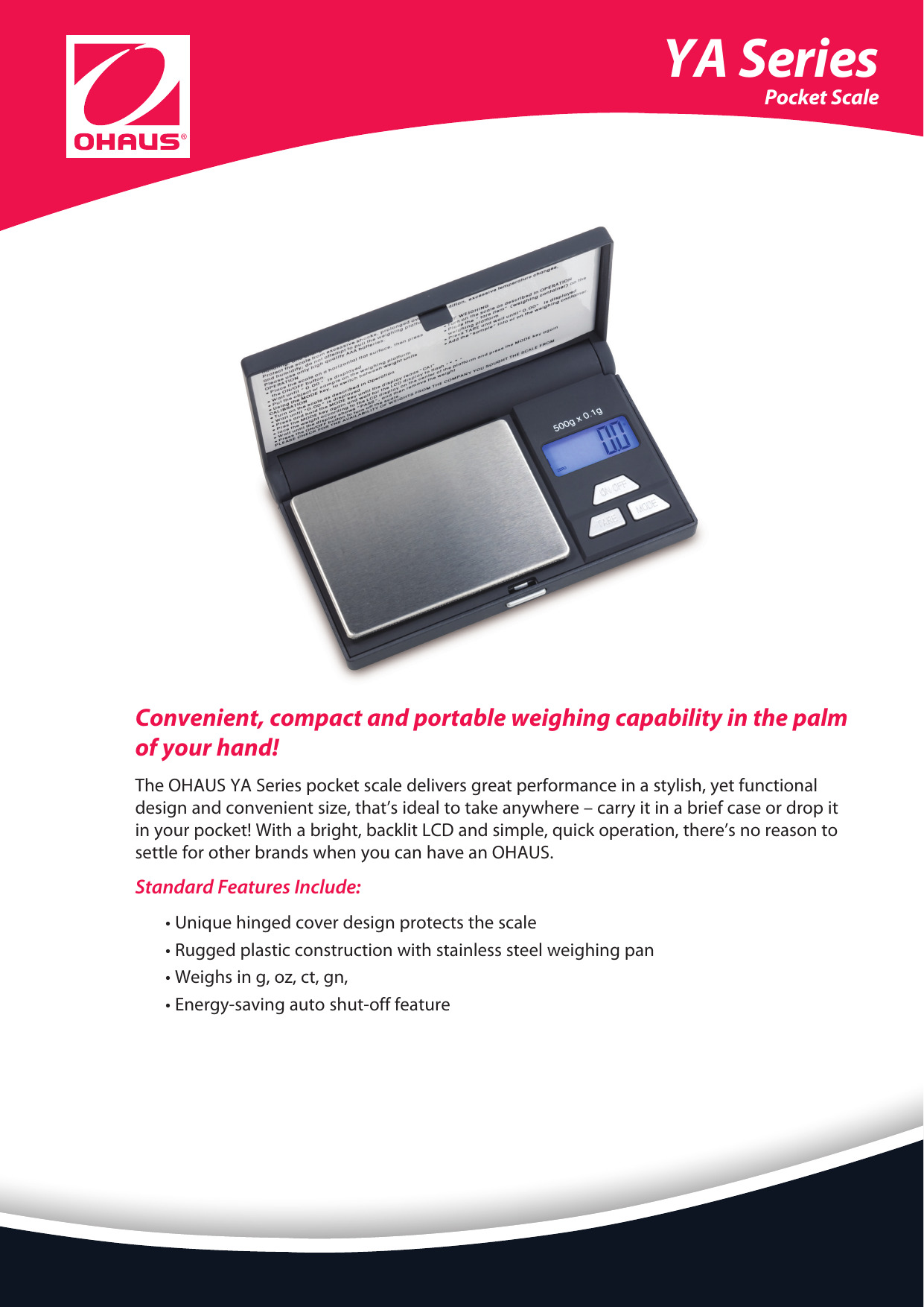 La balanza de bolsillo OHAUS YA102 ofrece un gran rendimiento en un diseño elegante, funcional y de tamaño conveniente, ideal para llevar a cualquier parte -dentro de un maletín o simplemente en el bolsillo-. Cuenta con una pantalla LCD retroiluminada brillante, y es muy fácil de operar…
